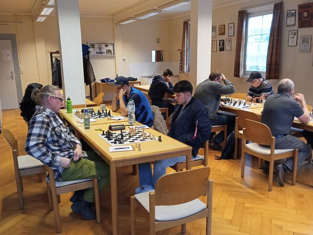 Wir haben dort einen großen Raum mit genügend Tischen und Stühlen für 32 Personen. Schachfiguren und Brett braucht keiner mitbringen, den wir haben ausreichend Spielmaterial.